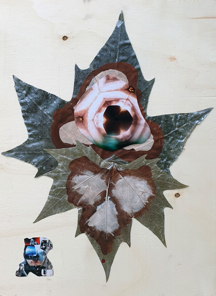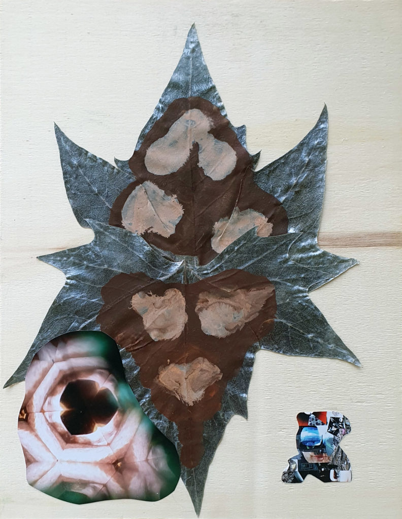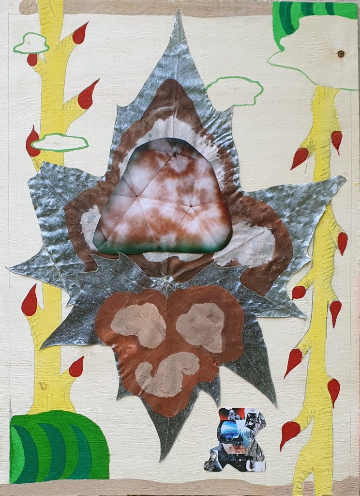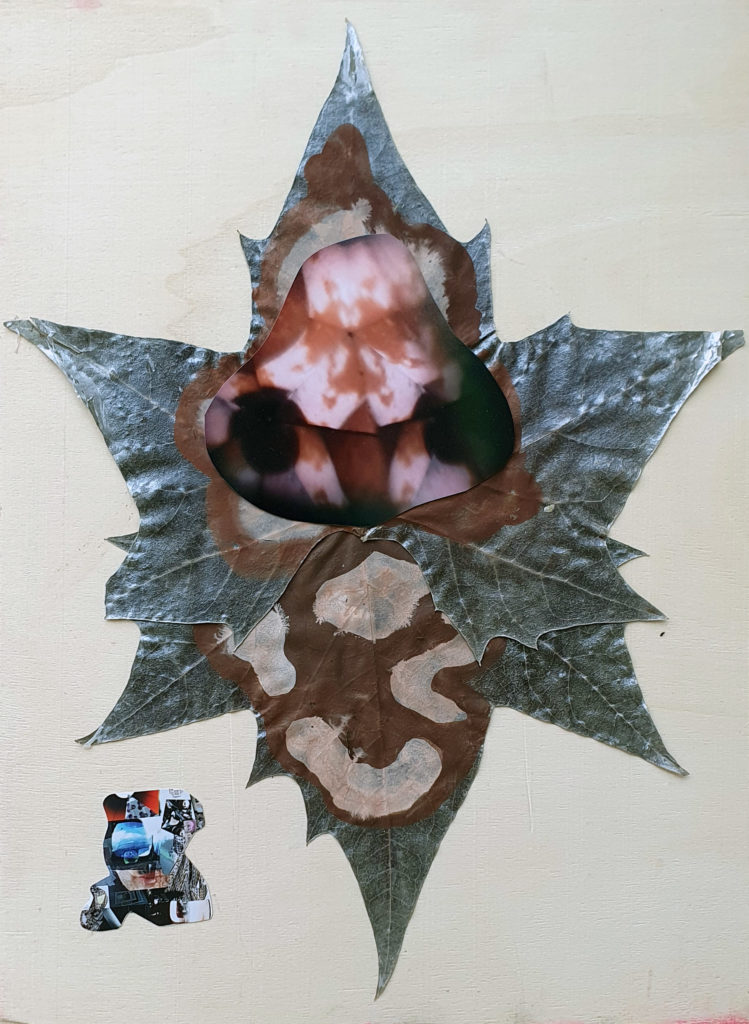 En combinant collage, peinture, feuilles de platane et symbolisme ésotérique, Platane Vitiligo met en relation des savoirs anciens et des réalités contemporaines, et transforme la fragilité en une force visuelle et mémorielle.