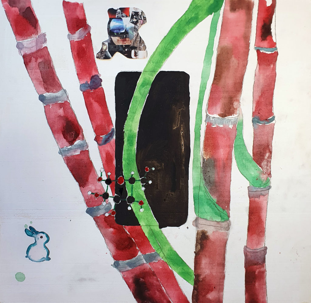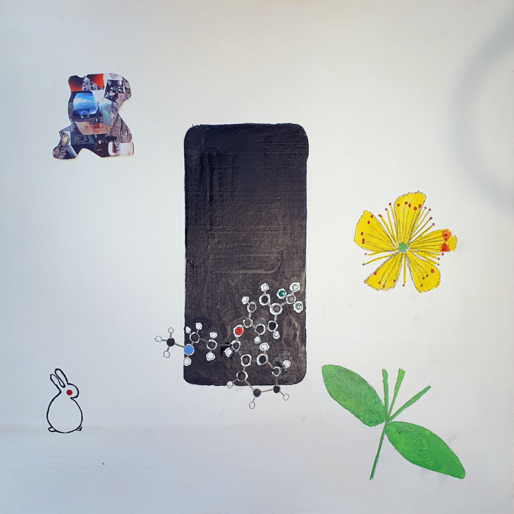 Chaque peinture révèle, de façon délicate et précise, les racines, feuilles ou fleurs de ces végétaux, tout en inscrivant symboliquement l’atome ou la formule chimique de leurs principes actifs. Cette alliance entre la dimension moléculaire et la dimension sensible fait directement écho à la pensée de Jeremy Narby, qui invite à faire dialoguer animisme et science.