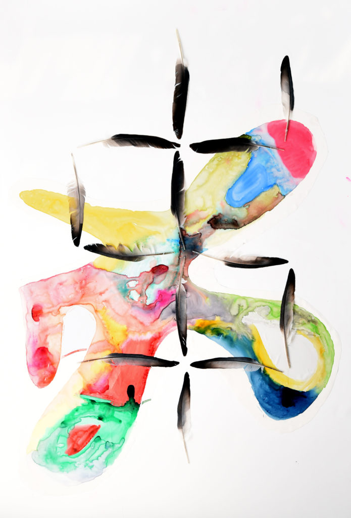 Spiritualité d’une pigeonne sous hypnose Spiritualité d’une pigeonne sous hypnosePlumes de pigeon·nesAquarelle marouflée sur carton plume90 × 120 cm2023